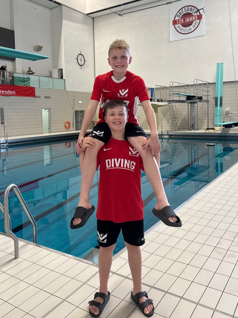 Anfang März fuhr Landestrainerin Mirja Wirth mit den beiden Kaderathleten Julius Steiger und Emil Radermacher nach Dresden zu den Deutschen Hallen Jahrgangsmeisterschaften 2026 der C-Jugend. Für Julius war es das zweite Jahr in der C-Jugend-Entscheidung. Emil gehört noch zur D11-Jugend, sollte aber schon mal in die Herrausforderungen des jüngeren C-Jugendjahrgangs hinein schnuppern und lernen, mit den höheren Anforderungen klar zu kommen. Und beide starteten zusammen im Synchronspringen vom 3m-Brett. In diesem Wettkampf sprangen Julius und Emil bis zum 5 von 6 Sprüngen mit um eine Medaille. Nach Runde Eins lagen sie sogar in Führung. Leider konnte Emil den abschließenden 2 1/2 Vorwärtssalto gehockt nicht sauber ins Wasser bringen und das Kampfgericht wertete den Sprung mit Null Punkten (Anmerkungen vom Schreiber: und genau diesen Sprung wünscht Emil mir als Sprung ins neue Lebensjahr und dann auch noch von 5m! Danke Emil ?!) Somit erreichten die Beiden den 5. Platz.