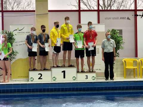 Mitte März fanden in Halle/Saale die Deutschen Meisterschaften der A+B Jugend in Halle/Saale statt. Für die beiden MSV’ler Matti Weidner und Malte Schöneich standen die Wettkämpfe unter keinem guten Stern. Malte musste schon vor seinem ersten Start wieder krank abreisen und Matti bekam in seinem Turmwettkampf große Rückenprobleme und konnte seine Sprungserie nicht bis zum Ende präsentieren. Trotzdem gewann er im ältesten A-Jugendjahrgang damit die Silbermedaille. Schon zwei Tage zuvor ersetzte er im Turm-Synchronspringen Malte und gewann mit seinem Sprungpartner Lars Keller aus Trier mit einer starken Leistung die Bronzemedaille.
