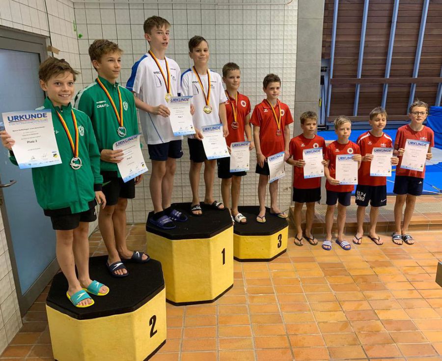 (gn/jub) Aachen: Vom 8. bis 10. Juli 2022 war der der Mainzer SV mit vier Aktiven in Aachen bei den Deutschen Meisterschaften der C-Jugend am Start, David Curda, Rayan Obbad und Jakob Zinecker im Jahrgang 2010 und Matteo Weiß im älteren Jahrgang 2009. Gerd Neuburger vertrat kurzfristig die erkrankte Trainerin der 4 Jungs Mirja Stähler. Die 3 Jüngeren hatten am ersten Wettkampftag gleich zwei Wettkämpfe zu absolvieren und starteten auf dem 1m Brett. Alle drei begannen noch etwas nervös. Sie kämpften sich aber in den Wettkampf hinein und wurden von Sprung zu Sprung sicherer. Am Ende waren es für Rayan der 12. Platz im großen Teilnehmerfeld, für Jakob Platz 13 und David Platz 15. Auf dem Turm erreichten alle drei dann persönliche Bestpunktzahl und belegten die Plätze 11 (Rayan), 14 (Jakob) und 15 (David), wobei Rayan mit 83 % der DSV-Norm ein ganz starkes Ergebnis ablieferte. Für Matteo Weiß waren es die ersten DJM. Er ging ebenfalls als erstes vom 1m Brett an den Start. Nach guten Pflichtsprüngen zeigte er bei den 4 Kürsprüngen leider noch ein paar Schwächen. Trotzdem erreichte er sehr gute 80% der DSV-Norm.