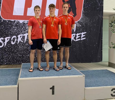Im 3m-Wettkampf bei den Männern gingen Jannick, Malte und Jakob an den Start. Jannick zeigte eine stabile Leistung und bestätigt seine Trainingsleistung. Für Malte lief der Wettkampf extrem gut. Er erreichte seine bisher beste Leistung auf dem 3m-Brett. Jakob schaffte sogar den Sprung ins Halbfinale. Für eine Finalteilnahme reichte es noch nicht ganz. In der Juniorenwertung belegte er damit den 4. Platz. Am vorletzten Wettkampftag lief es für das Trio auf dem Turm sehr gut und alle drei schafften den Sprung ins Halbfinale und dann ins Finale. 3 Runden À 6 Kürsprünge, eine ganz besondere Herausforderung! In der Endabrechnung belegte Jakob Rang 4, Malte Rang 6 und Jannick Rang 7! Dabei steigerte sich Malte als Einziger von Runde zu Runde, von 205,45 Punkten im Vorkampf über 223,85 Punkte auf 233,40 Punkte im Finale! In der Juniorenwertung wurde Jakob mit der Goldmedaille für seine gute Leistung belohnt. Er wurde ebenfalls Juniorenmeister in der Kombinationswertung. In der Kombi der Offenen Klasse gab es sogar einen 3-fach Erfolg für das Team des MSV 01, Jakob gewinnt Gold, Malte Silber und Jannick Bronze. Kein anderer Verein in Deutschland hatte Springer auf allen Höhen am Start, nur der Mainzer SV!