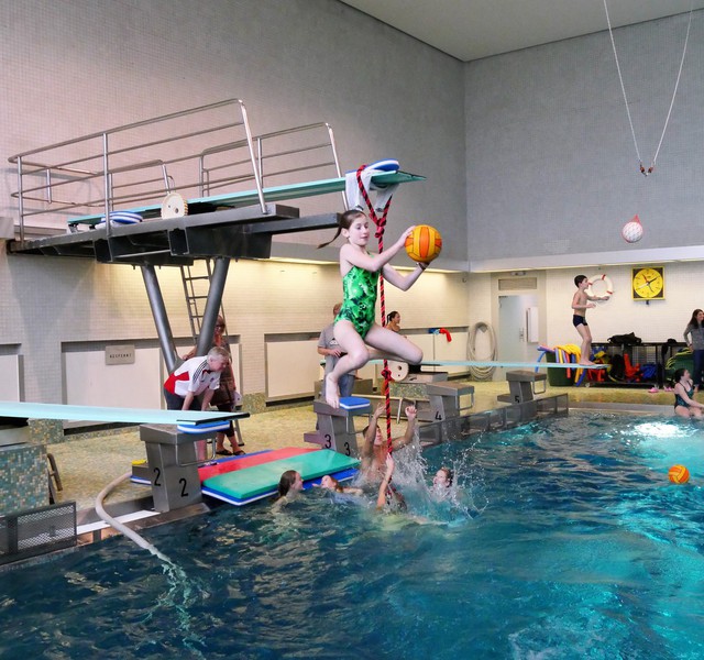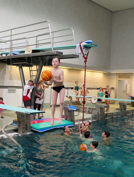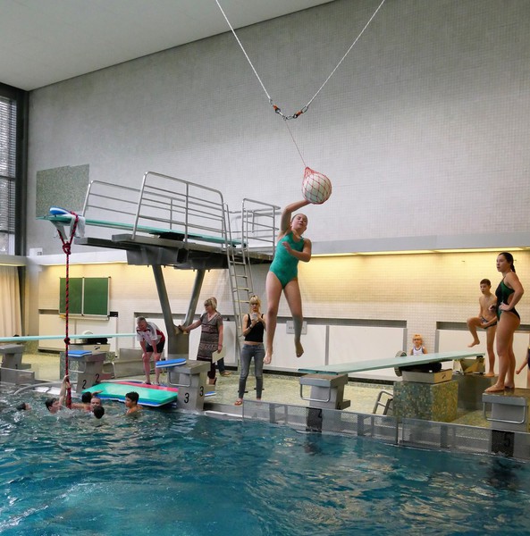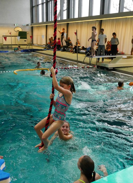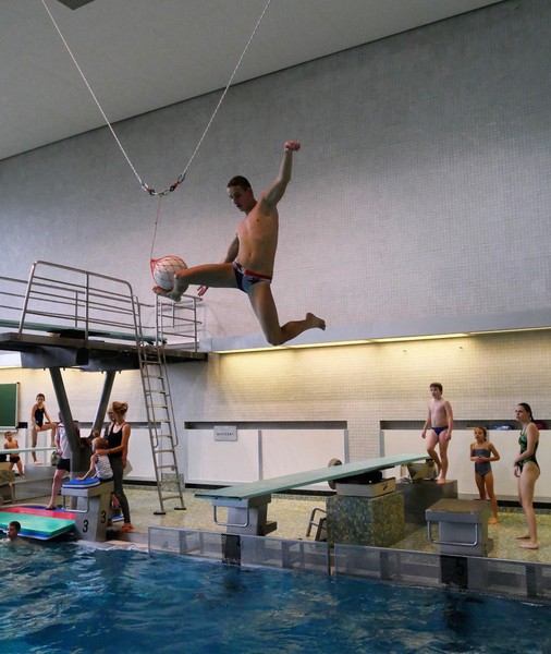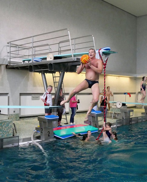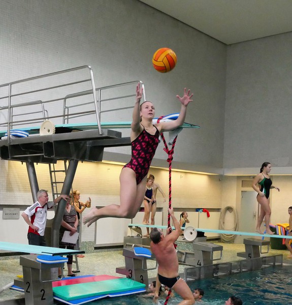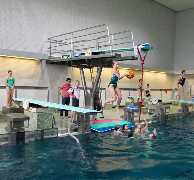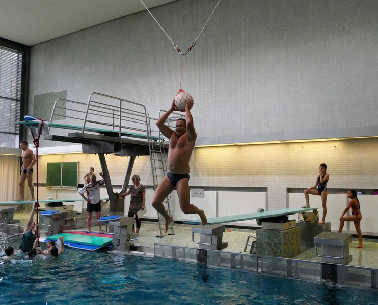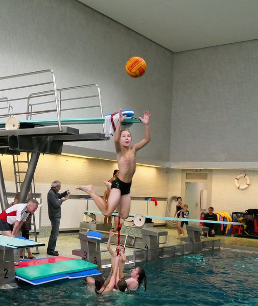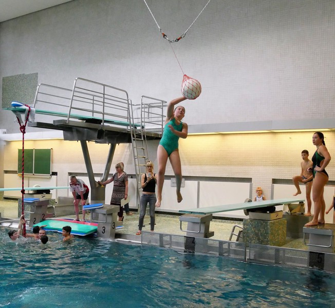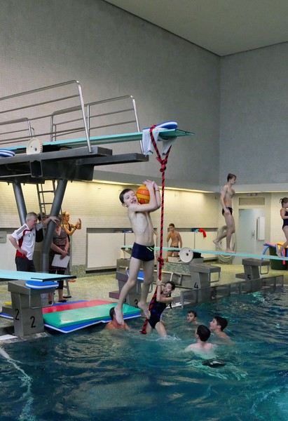 (jub, 02.12.2017) Das diesjährige Adventspringen überraschte mal wieder alle: die Aktiven, die mit den geforderten Übungen, von "über das Wasser Laufen", Korbwerfen im Wasser, Ballspringen, Seilklettern, Ball fangen bis hin zu Reifen-Eintauchen nicht gerechnet hatten, aber auch die mitmachenden Trainer, die überrascht waren von der Anstrengung des ausgedachten Parcours.