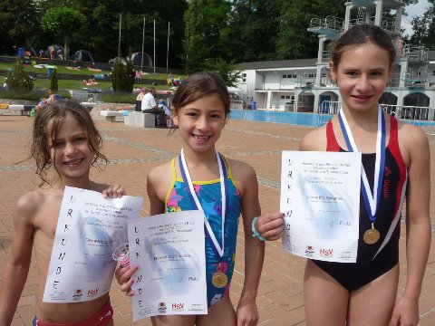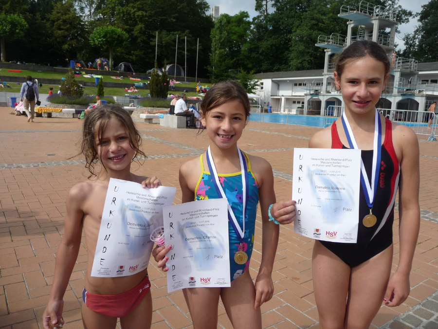 Wettkampfpremiere hatten dabei die 3 Kinder von der früheren Mainzer Springerin Karina Effing - Julian, Charlize und Vivienne Demetriou. Und Charlize und Vivienne gewannen auch gleich mal ihre beiden Anfängerentscheidungen auf dem 1m-Brett, der erst 6-jährige Julian belegte einen 4. Platz.