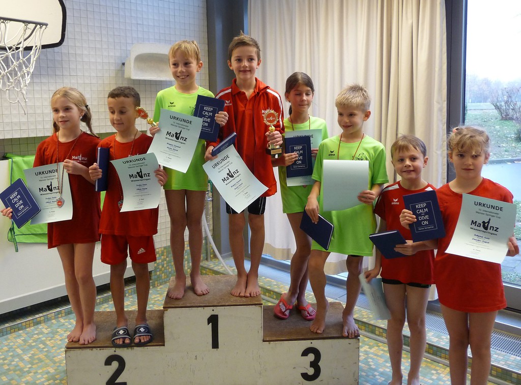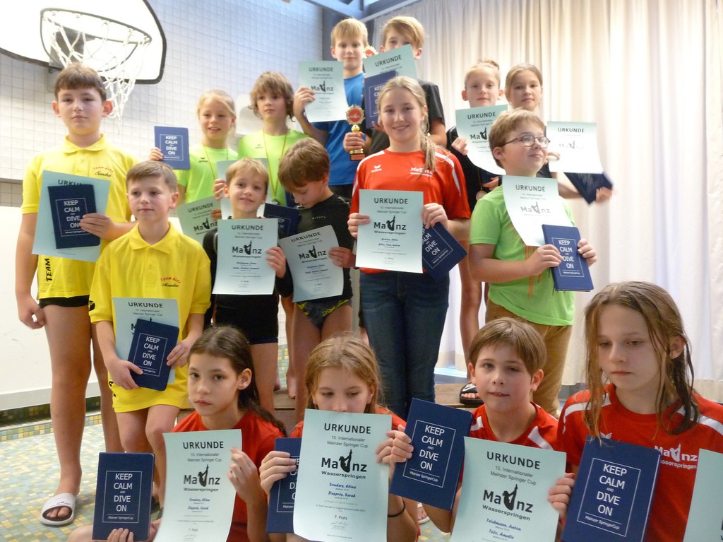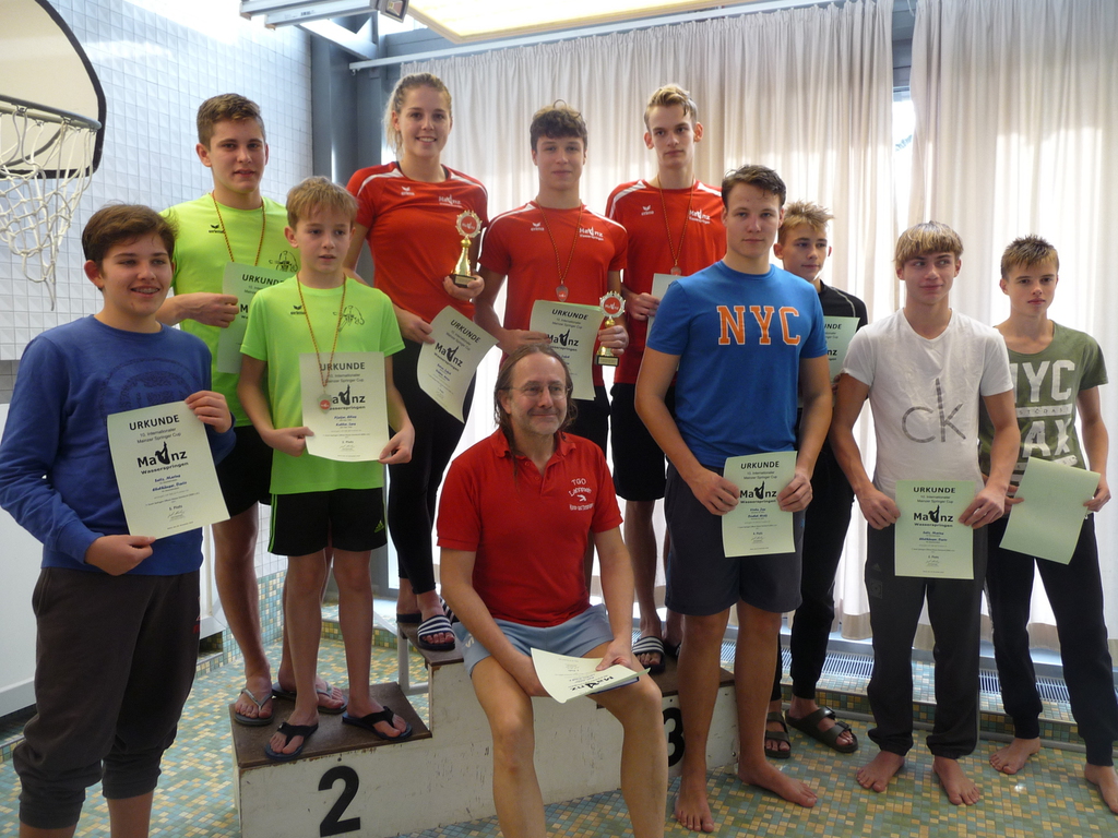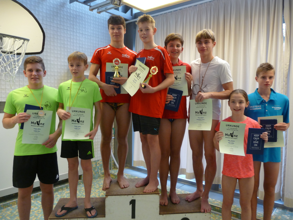 (jub, November 2018): Seit nunmehr 10 Jahren treffen sich Ende November viele süddeutsche Wasserspringer in Mainz beim Mainzer SpringerCup. Zweierteams messen sich dabei in 7 Wertungsklassen, von den Jüngsten der E-Jugend bis zu den Damen und Herren der offenen Klasse, mit Einzel- und Synchronsprüngen von 1m und 3m. Erstmals gewann bei der diesjährigen Jubiläumsveranstaltung der SSV Trier mit 2480 Punkten bei 5 gewerteten Teams den Wanderpokal für die beste Gastmannschaft. Auf Platz kam Vorjahressieger Höchster SV mit 1845,25 Punkten bei 4 gewerteten Teams. Mehr Punkte, nämlich 3098,08, sammelte nur der Mainzer SV (6 Teams in der Punktewertung), der aber als Gastgeber beim Wanderpokal nicht mit gewertet wird.